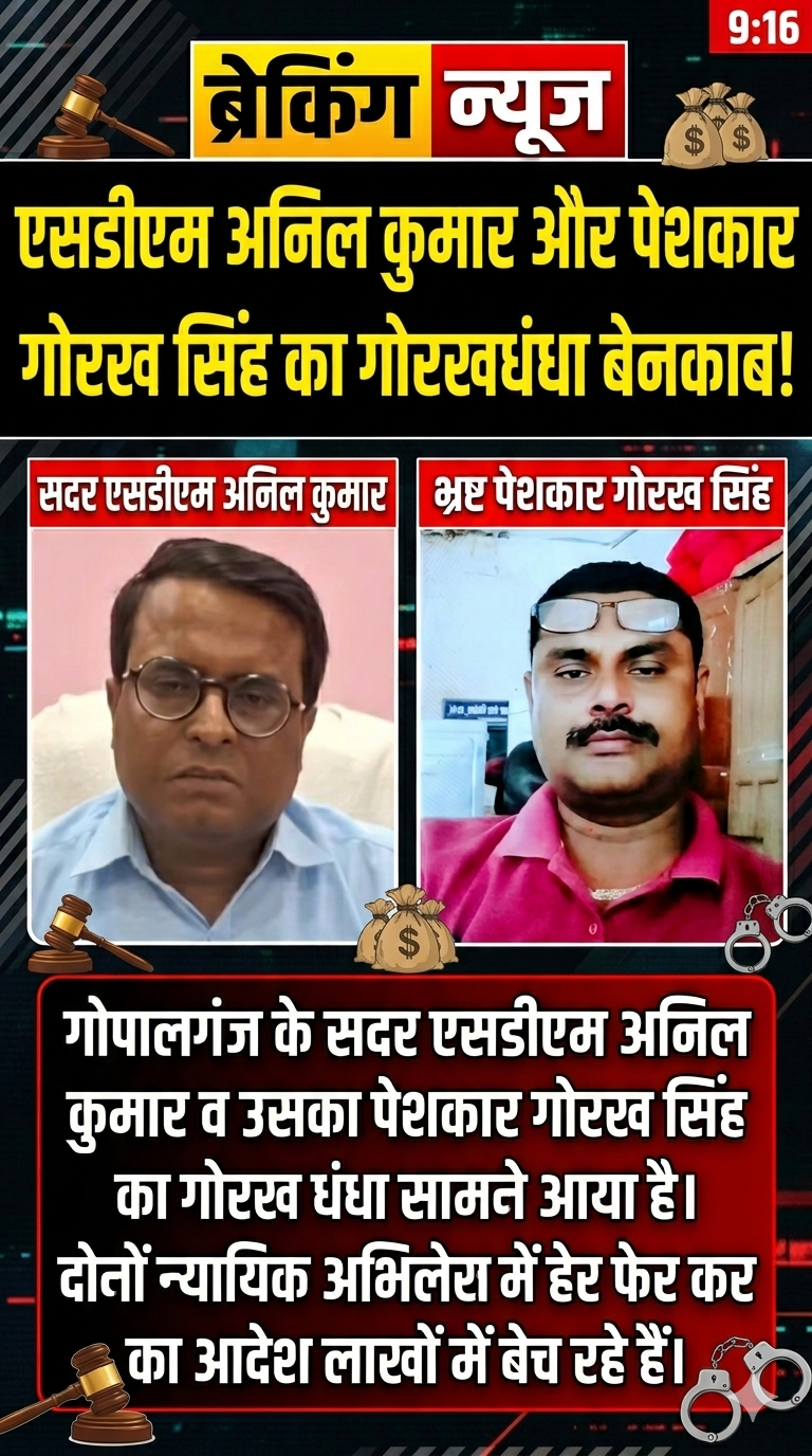गोपालगंज के सिधवलिया में न्यायिक अभिलेख में कथित हेरफेर और अवैध लेन-देन का बड़ा मामला सामने आया है, जिसमें भ्रष्ट SDM और पेशकार पर गंभीर आरोप लगे हैं।